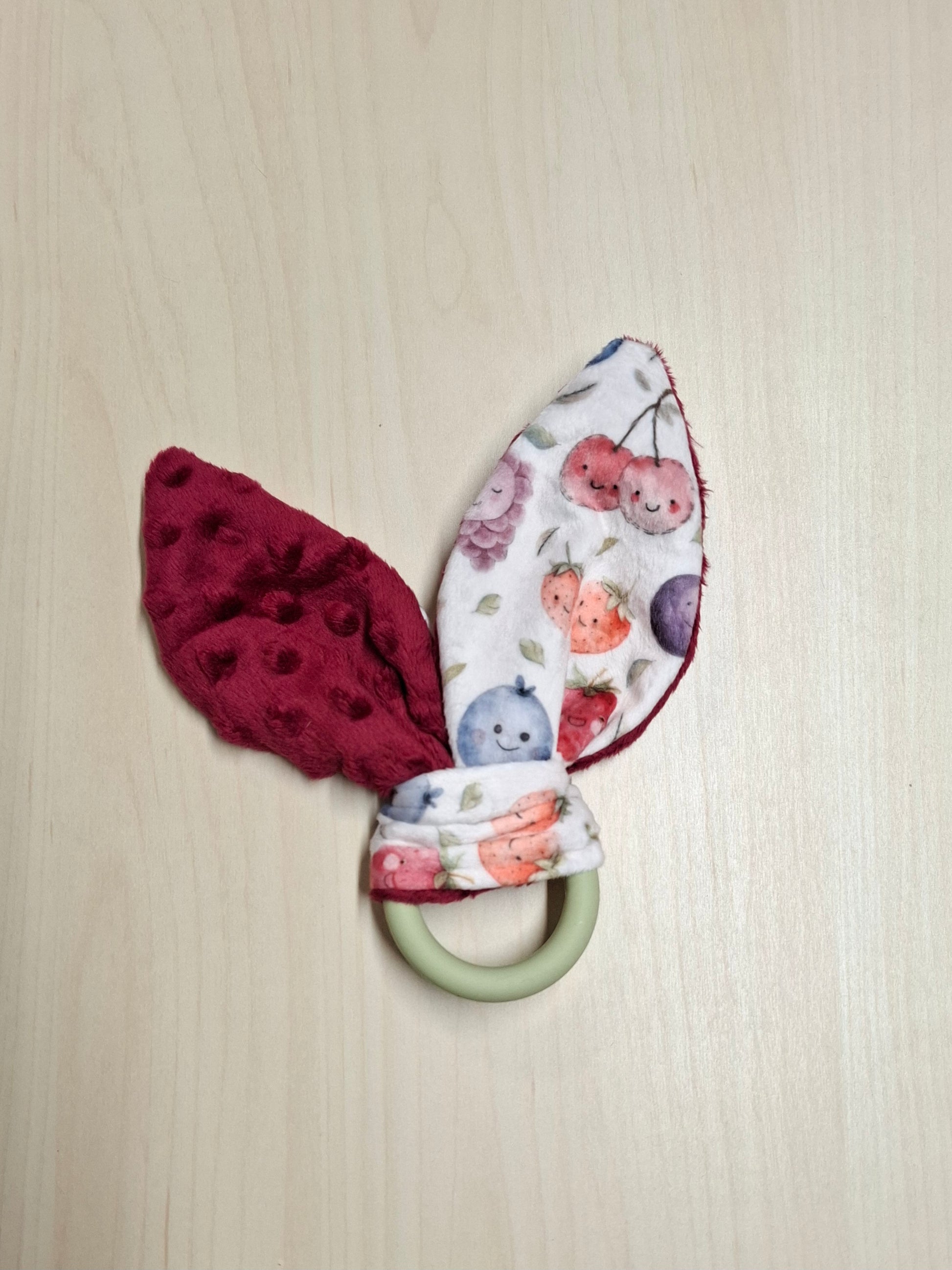 Concernant l’anneau de dentition qui est de qualité alimentaire, nous choisissons avec soin l’agencement de l’anneau au motif. Il y aura toujours de petites variantes dans les couleurs, ce qui fait son caractère unique.